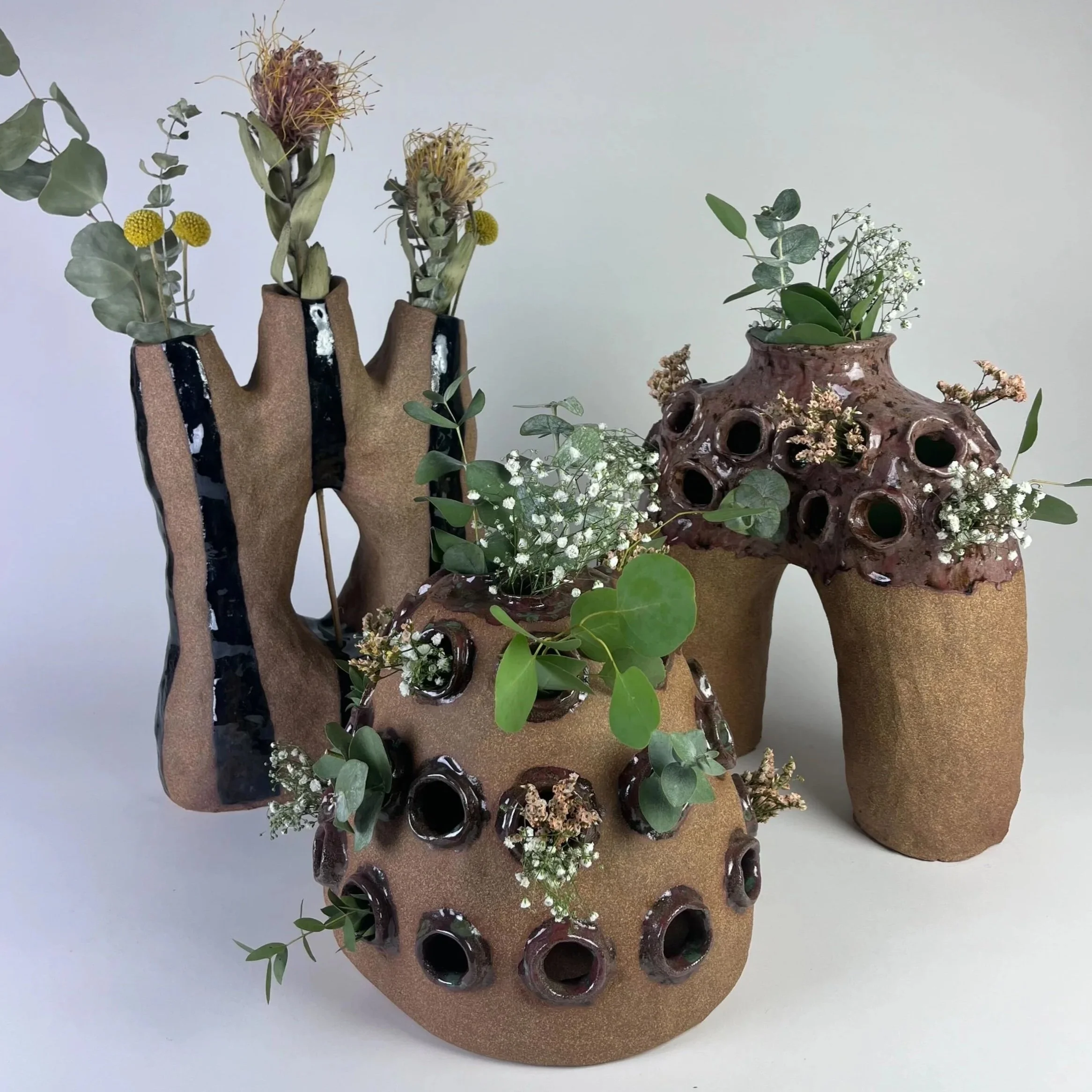 She has been working with clay for about four years, gravitating toward organic shapes and vibrant colors while experimenting with ways to combine clay with other media.